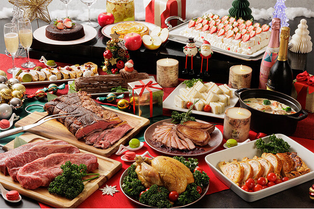 キラキラ輝く聖夜にふさわしい、とびきり贅沢なディナーブッフェ。鉄板の上でジュワッと焼き上げる「はりま牛ステーキ」をはじめ、香ばしい「ローストチキン」やジューシーな「ローストビーフ」など、シェフ自慢のメニューがずらりと並びます。さらに、クリスマスツリーに見立てたロールケーキなどクリスマススイーツもたっぷりご用意!ご家族やご友人と一緒に、笑顔あふれる”とっておきの夜”をお過ごしください。