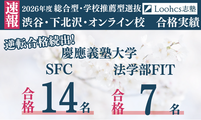 総合型選抜・推薦入試専門塾のルークス志塾(本部:東京都渋谷区)は、2025年度慶應義塾大学のAO・FIT入試において、渋谷校舎から SFC(湘南藤沢キャンパス)で14名、FIT入試(法学部)で7名 の合格者を輩出しました。