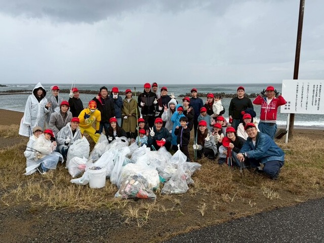 当日は小雨交じりの天候の中、「BEACH CLEAN FUKUI」と書かれた赤い帽子をかぶった参加者たちが協力して浜地海水浴場を清掃。プラスチックごみ、漁網、ペットボトルなど約50kgのごみを回収しました。活動を通じて、地域の子どもたちが自然の大切さを学び、大人たちも医療を超えた「地域の健康づくり」を体感する機会となりました。