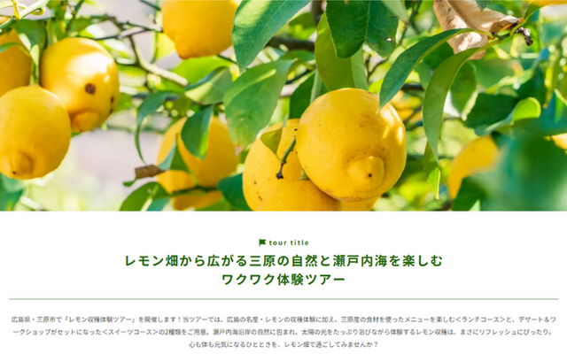 - ツアー名: レモン畑から広がる三原の自然と瀬戸内海を楽しむワクワク体験ツアー- 開催日時: