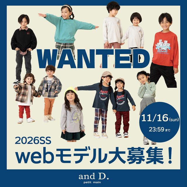 株式会社ナルミヤ・インターナショナル(東京都港区芝公園2-4-1、代表取締役社長執行役員: 國京 紘宇)のブランド「and D. petit main(アンドディー. プティマイン)」が2026年春夏のwebモデルを募集中です。インスタグラムハイライトに掲載の【ご応募フォーム】から、アンケートにお答えいただきご応募完了!締め切りは11/16(日)23:59までです。
