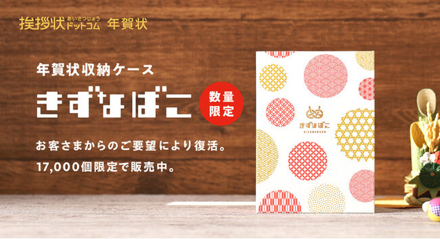 株式会社グリーティングワークス(所在地:大阪市北区、代表取締役会長:徳丸博之)は、挨拶状ドットコムの年賀状印刷サイト(https://nenga.aisatsujo.jp/)にて、届いた年賀状をきずなの歴史書として保管できるオリジナル年賀状収納ケース「きずなばこ」の提供を、ユーザーの要望により再開しました。17,000個限定で販売する「きずなばこ」は、挨拶状ドットコムの年賀状印刷サイトで注文いただいた方のみ購入いただけます。