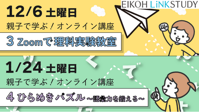 株式会社増進会ホールディングス(Z会グループ)のグループ会社、株式会社栄光(本社:東京都千代田区 代表取締役社長:下田勝昭)が運営するオンライン進学塾「EIKOH LiNKSTUDY(栄光リンクスタディ)」は、年長対象のオンライン講座「親子で学ぶ!オンライン講座~理科実験教室・ひらめきパズル」を、2025年12月6日(土)、2026年1月24日(土)に無料開催します。