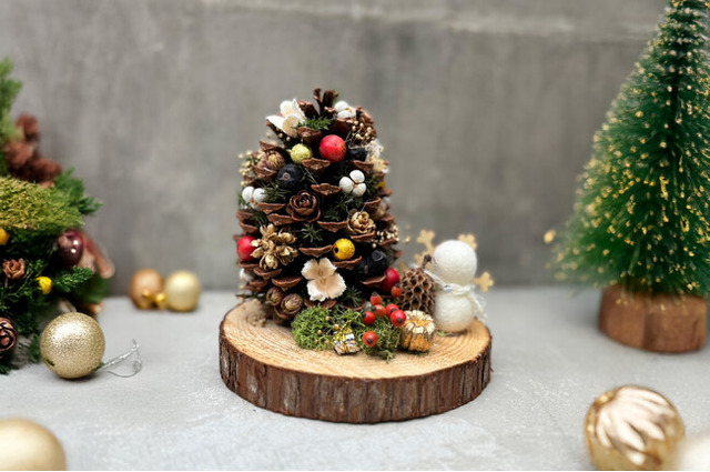 当日は、北山杉の切り株を土台とした10~15cmの大王松の松ぼっくりをベースに、常緑樹の葉や実、オーナメントなどを自由に組み合わせ、個性溢れるオリジナルのミニツリーづくりをお楽しみいただけます。材料はすべて用意しておりますので、手ぶらでのご来場が可能です。