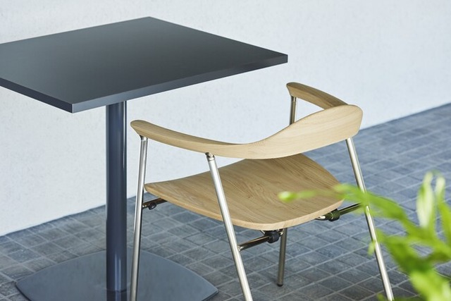 〈クロッサWOOD〉の背座には、比重が軽く力強い木目を持つ国産広葉樹のクリ材を採用しています。クリ材はこれまで、強度が求められる椅子などの家具用材としてはあまり用いられてこなかった素材です。本製品では、当社が培ってきた材料集成の技術を活かし、径の太いものから細いもの、曲がったものまで、多様な国産クリ材を一定の細幅に加工。積層構造として組み合わせることで、細やかで美しい意匠性を実現しました。さらに、スチール製脚部とのハイブリッド構造により強度を補完し、クリ材の特性である軽さを、移動や設営のしやすさといった折りたたみチェア特有の利便性へと転化しています。当社の木工技術による明るく滑らかな仕上げが、普遍的なフォルムに温かみと豊かな質感を与えています。[画像3: https://prcdn.freetls.fastly.net/release_image/13161/42/13161-42-9385ba597a30bee042d8ffee7287cd6f-3900x3900.jpg?width=536&quality=85%2C75&format=jpeg&auto=webp&fit=bounds&bg-color=fff ]