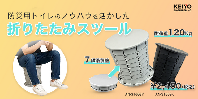 「座る」と「備える」を、この一台で。 もともと非常用トイレとして開発された設計をベースに、”スツールとしての使いやすさ”と”防災品質のタフさ”を両立した「折りたたみスツール」が新登場します。