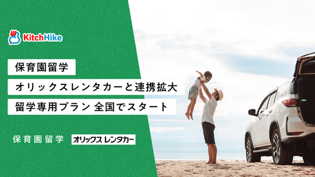 株式会社キッチハイク(本社:東京都台東区、代表取締役:山本雅也)が運営する「保育園留学」は、オリックスレンタカーと連携し、保育園留学を利用するご家族に向けて、全国でレンタカーの留学専用プランの提供を開始します。地域での移動をサポートすることで、更なる地域での消費や交流を促進し、地域への貢献を高めていきます。