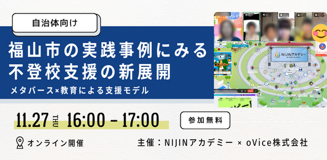 株式会社NIJIN(本社:東京都江東区、代表取締役:星野達郎)が運営する不登校オルタナティブスクール『NIJINアカデミー』は、2Dメタバースプラットフォームを提供する「oVice株式会社」は、2025年11月27日(木)に、全国の自治体・教育委員会・学校関係者様を対象とした共催セミナーを開催いたします。