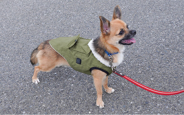本製品は、お腹の部分にヒーターを内蔵した小型犬用の防寒ペット服です。