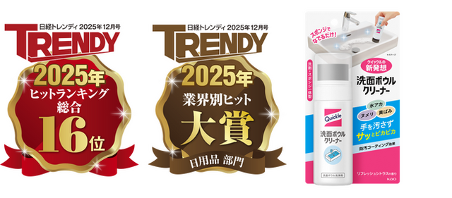 花王の『クイックル 洗面ボウルクリーナー』は、『日経トレンディ』2025年12月号(2025年11月4日発売)の「2025年ヒット商品ベスト30」にて16位に選出されました。同時に「業界別ヒット2025」においても、「日用品部門 大賞」を受賞しました。