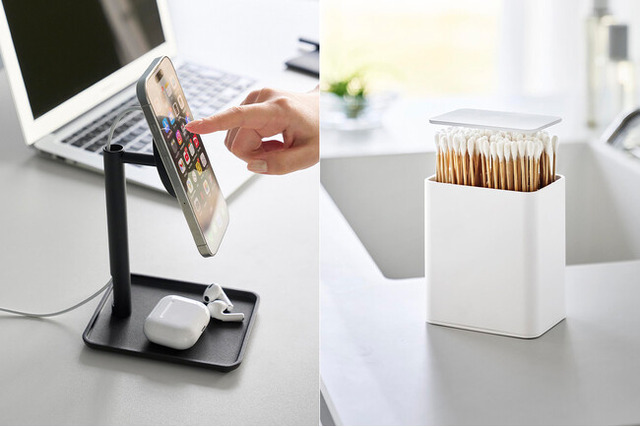 スタイリッシュなデザインのトレー付きスマートフォンスタンドです。