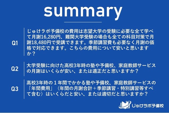 [画像5: https://prcdn.freetls.fastly.net/release_image/107104/167/107104-167-698032e7b3c54257f6ecb69bd657ed54-1354x905.png?width=536&quality=85%2C75&format=jpeg&auto=webp&fit=bounds&bg-color=fff ]Q. じゅけラボ予備校の費用に対する評価
