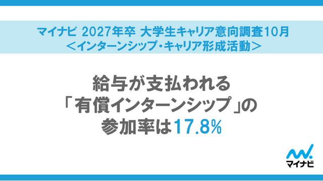 株式会社マイナビ(本社:東京都千代田区、代表取締役 社長執行役員:土屋芳明)は、2027年卒業予定の全国の大学生、大学院生を対象に実施した、「マイナビ 2027年卒 大学生キャリア意向調査10月<インターンシップ・キャリア形成活動>」の結果を発表しました。