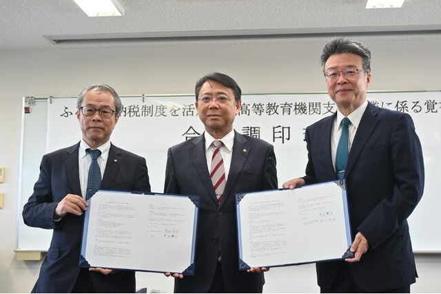 高知工業高等専門学校(高知県南国市 校長:江口忠臣 以下「高知高専」)は、令和7年10月23日(木)に南国市(市長:平山耕三)と「ふるさと納税制度を活用した高等教育支援事業」に係る覚書を締結し、調印式を実施しました。調印式は同じく南国市と覚書を締結した国立大学法人高知大学(学長:受田浩之 以下「高知大学」)と合同で行いました。合同調印式は高知大学物部キャンパスにおいて執り行われ、高知高専から江口忠臣校長、南国市から平山耕三市長、高知大学から受田浩之学長が出席し覚書に調印しました。