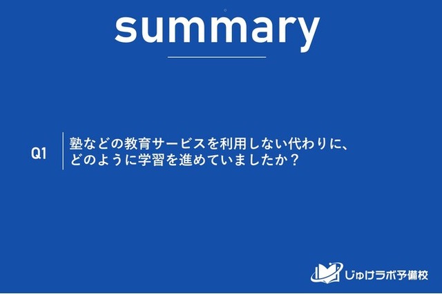 [画像2: https://prcdn.freetls.fastly.net/release_image/107104/168/107104-168-872550c97d4e50955dc54a891fb7b478-1354x905.png?width=536&quality=85%2C75&format=jpeg&auto=webp&fit=bounds&bg-color=fff ]Q: 塾などの教育サービスを利用しない代わりに、どのように学習を進めていましたか?