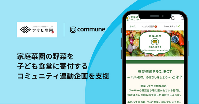 相互交流で信頼を育む「Commune(コミューン)」を提供するコミューン株式会社は、株式会社アサヒ農園が運営する野菜好きが集まるコミュニティ「野菜遺産PROJECT ~「いい野菜」のはなしをしよう~」(以下、「野菜遺産PROJECT」)において、コミュニティユーザーが子ども食堂への寄付に気軽に参加できる新たな企画を実施することをお知らせします。