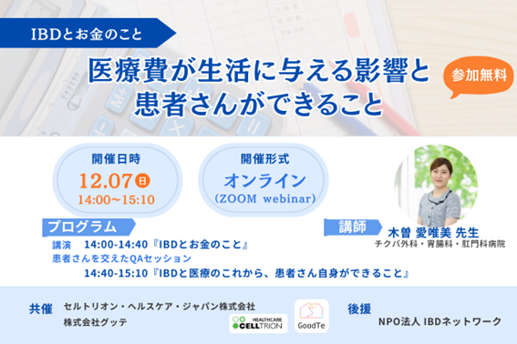 株式会社グッテとセルトリオン・ヘルスケア・ジャパン株式会社は、IBD患者や家族が治療と生活の両立に必要なお金に関して学べる講演を3回シリーズで開催します。第1回となる「医療費が生活に与える影響と患者さんができること」は12月7日(日)に開催いたします。