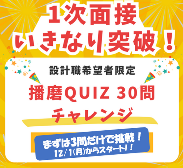 ● 企画名称: 【 設計職志望限定 】 1次面接いきなり突破!播磨Quiz30問チャレンジ!