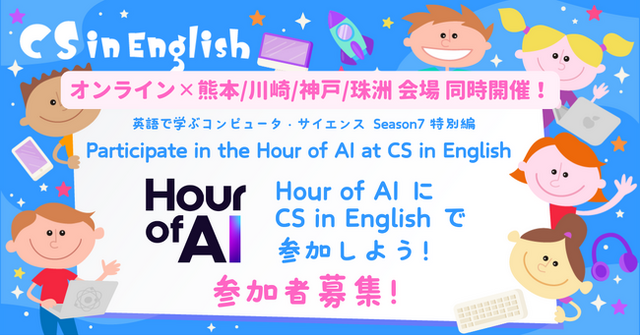 一般社団法人Kids Code Club(福岡)、Seattle IT Japanese Professionals(米国シアトル)、特定非営利活動法人くまもとLR ネット(熊本)、Future coders(川崎)、神戸市役所経済観光局新産業創造課(神戸)、ピースウィンズジャパン(能登/珠洲)は、2025年12月7日(日)に、英語でプログラミングを学ぶイベント「CS in English Season 7」の特別編「Participate in the Hour of AI(R) at CS in English / Hour of AI(R) に CS in English で参加しよう!」を開催します。