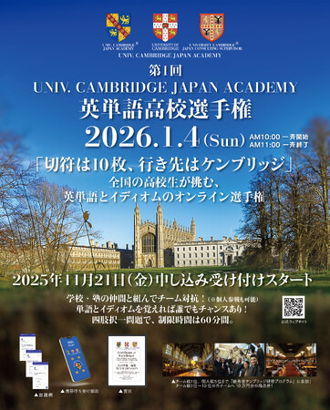 集中出版株式会社がUNIVERSITY CAMBRIDGE JAPAN CONSULTING SUPERVISOR Co. Ltd. と共催で、現役高校生を対象とする全国規模のオンライン選手権「第1回 UNIV. CAMBRIDGE JAPAN ACADEMY 英単語高校選手権」の参加登録を11月21日(金)午後12時より開始しました。12月15日(月)までにお申し込み頂くと、参加費用が60%OFFとなる早割が適用されます。