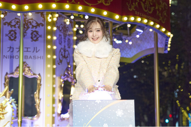 11月20日(木)に実施された点灯式には、タレントの藤田ニコルさんをゲストにお招きしました。メインシンボルの“麒麟ゴーラウンド”が点灯すると、会場からは大きな歓声が上がり、日本橋の街が幸運の煌めきに包まれました。