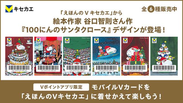 CCCMKホールディングス株式会社(本社:神奈川県横浜市、代表取締役社長兼CEO:高橋 誉則)は、Vポイントアプリの「モバイルVカード」を好きなデザインに着せかえできる「Vキセカエ」(https://ip.tsite.jp/guide)において、人気絵本作家の作品がデザインされた「えほんシリーズ」の第二弾として、『100にんのサンタクロース』デザイン6種類を、2025年11月26日(水)から2026年11月26日(木)まで期間限定で販売いたします。