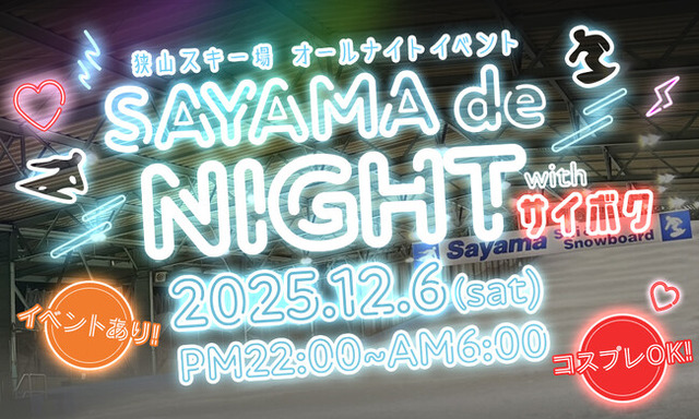 西武レクリエーション株式会社(本社:埼玉県所沢市、社長:依田龍也)が運営する狭山スキー場(埼玉県所沢市)では、これから本格的なウィンタースポーツシーズンを迎える12月の特別イベントとして、12月6日(土)には夜から朝までたっぷり滑りたいスキーヤー・スノーボーダーに向けたオールナイトイベント第1弾「SAYAMA de NIGHT with サイボク」と、12月20日(土)・21日(日)・25日(木)には小さなお子さまやファミリー向けのクリスマスイベント「サンタと一緒に遊ぼう!雪遊び in 狭山スキー場」を開催します。