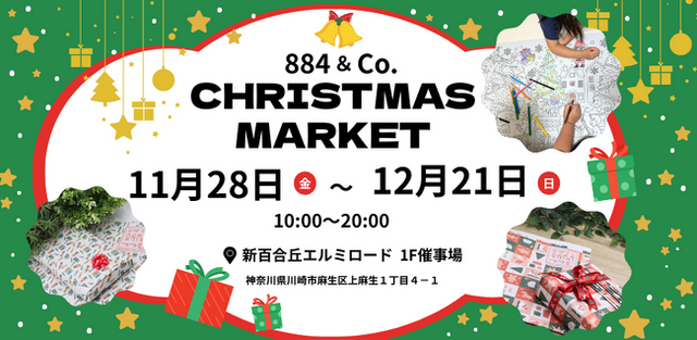 11月28日(金)~12月21日(日)、新百合ヶ丘エルミロードで開催される「884&Co.クリスマスマーケット」に出店し、クリスマス限定のデザイン新聞「つつむ」の一般販売を行います。また人気の高い「とにかく大きい新聞ぬりえ」も新たなデザインを追加し、皆様のお越しをお待ちしています。