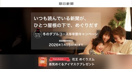 株式会社朝日新聞社(代表取締役社長CEO:角田克)は、2025年11月26日(水)~2026年1月15日(木)、紙面購読者限定のデジタル版「ダブルコース半年割」を新規ご購読開始いただいた方を対象にもれなく、朝日新聞オリジナルのスリーブ付き、花王 めぐりズム「蒸気めぐるアイマスク」をプレゼントする「デジモとめぐる。冬のダブルコース半年割キャンペーン」を実施します。