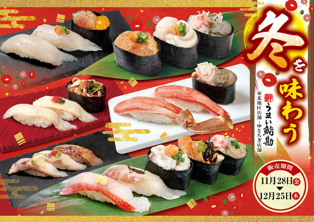 株式会社アミノ(本社:宮城県仙台市、代表取締役執行役員社長:上野 敏史)が運営する寿司業態 「うまい鮨勘」では、東北地区・ゆとろぎ店舗において「冬を味わう」と題したフェアを2025年11月28日(金)から12月25日(木)までの期間限定で販売いたします。