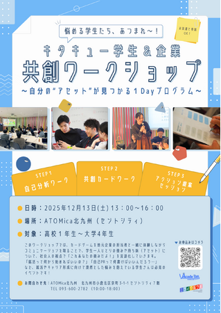 子ども向けイベントや小中高生・大学生向けのアントレプレナーシップ教育を展開する株式会社ミライクルラボ(本社:東京都千代田区、代表取締役社長:渡邉涼太、以下、ミライクルラボ)は、北九州地域の学生と企業が共に学ぶイベント「キタキュー学生&企業 共創ワークショップ~自分の“アセット”が見つかる1Dayプログラム~」を、2025年12月13日(土)に開催します。