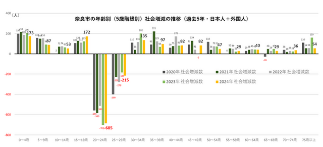 奈良市の5歳階級別の転入出を見ると、20~24歳での転出超過が非常に多い状態です。これらは大学卒業・就職を機に市外へ転出していることが予想され、就職時期での定住促進対策が不可欠となっています。