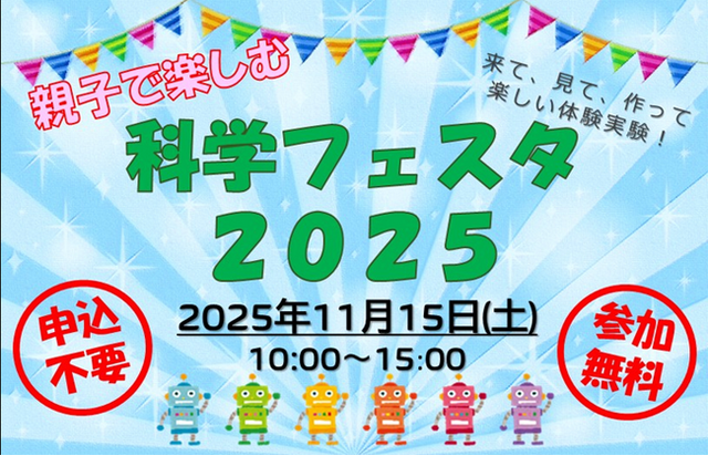 鶴岡工業高等専門学校(山形県鶴岡市 校長事務代理:宍戸 道明 以下「鶴岡高専」)は、令和7年11月15日(土)、「親子で楽しむ科学フェスタ2025」を開催しました。本イベントは、科学実験やものづくりを実際に体験してもらい、科学の不思議やものづくりの楽しさを実感してもらうことを目的として開催しているもので、今年で26回目の開催となります。コロナ禍以降は参加人数を制限しての開催が続いていましたが、今年は事前申込不要の自由参加形式で実施し、前回を超える約600名もの方々にご来場いただきました。