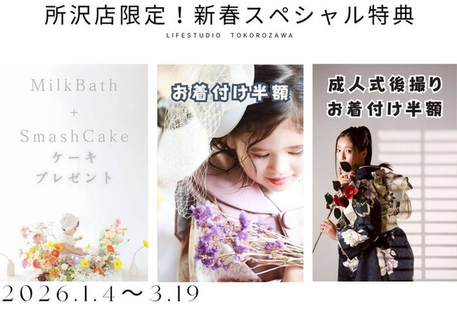 埼玉県所沢市にあるフォトスタジオ「ライフスタジオ所沢店」では、2026年1月1日~3月19日の期間、ベビーからご家族まで楽しめる3つの特典をご用意した“新春スペシャル”キャンペーンを実施いたします。非日常の「ミルクバス撮影」や「七五三・成人式後撮り」の着付け半額など、お得に記念撮影を残すチャンスです。