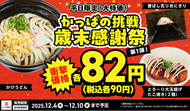 【店内飲食限定 「かっぱの挑戦 歳末感謝祭」 第1弾!「たこ焼き」「おにぎり」「うどん」各82円(税込各90円) 概要】