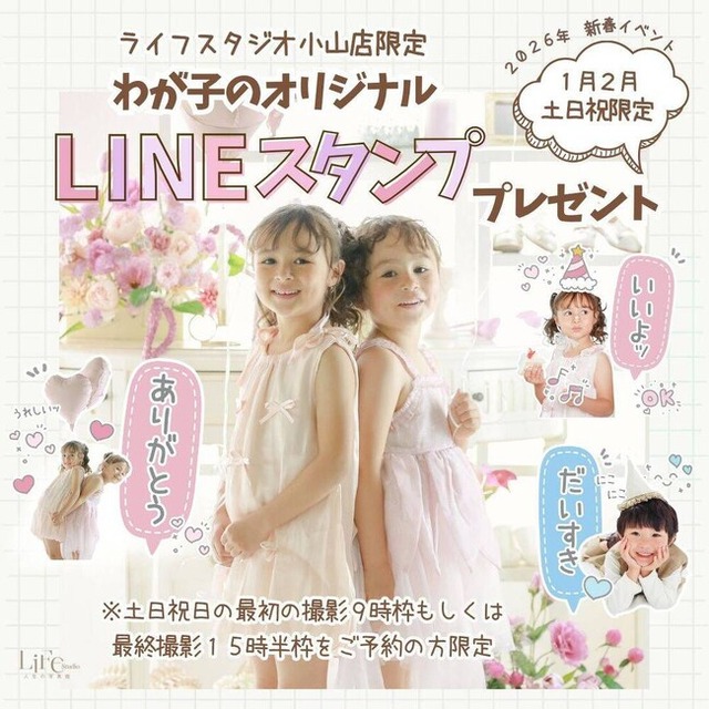 栃木県小山市にあるフォトスタジオ「ライフスタジオ小山店」では、2026年1月3日~2月28日の期間、土日祝日の9:00 / 15:30 撮影枠をご予約いただいたお客様を対象に、オリジナルLINEスタンプをプレゼントする限定キャンペーンを実施します。家族写真・七五三・バースデーなど、冬の人気シーズンにあわせて楽しめる特別企画です。