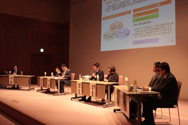 第2部のパネルディスカッションでは、テーマを「舞鶴市の活性化と防災対策を如何に進めるか」と設定し、舞鶴高専の林康裕校長が司会を務め、パネリストとして、鴨田秋津舞鶴市長、京都大学の牧紀男教授、大阪大学の柏尚稔教授、NPO法人まいづるネットワークの会の伊庭節子理事長、舞鶴なびの西村綾夏副編集長、舞鶴市の泉光信危機管理・防災課長が参加しました。冒頭に柏教授から「近年の被害地震の教訓」と題して話題提供、泉氏から舞鶴市の現状についての情報提供があり、その後、舞鶴市で想定される災害や、それに対する備えの現状、さらに防災と地域活性化についての議論が活発に行われました。防災力の向上には地域の活性化が欠かせないこと、舞鶴市におけるそれらの現状や解決策について、さまざま立場からの意見が出され、とても有意義なディスカッションとなりました。