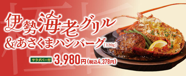 迫力のある伊勢海老のグリルと、あさくま自慢の肉汁ハンバーグを一皿で堪能できる、季節限定の贅沢なコンビ商品です。