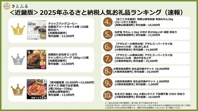 ふるさと納税ポータルサイト「さとふる」を運営する株式会社さとふる(本社:東京都中央区、代表取締役社長 兼 CEO:藤井 宏明)は、「さとふる」における<近畿版>2025年人気お礼品ランキング(速報)(※1)を発表します。