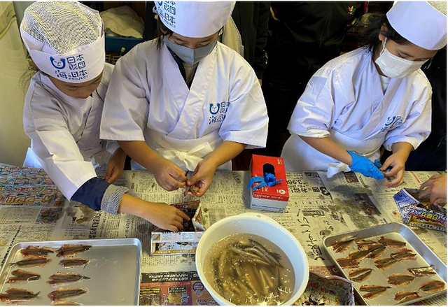 「日本さばける塾in雲仙」参加の小学生14名は、京泊漁港にある西浜公民館の調理室において2班に分かれてサバの刺身づくりとカタクチイワシの天ぷらづくりを交互にチャレンジしました。サバの刺身づくりでは、実際に包丁を使ってサバの頭を切り落としたり、三枚におろしたりしました。獲ってすぐのサバは鮮度が良くとても硬いため、刺身になるまでは大変な作業となりました。またカタクチイワシの天ぷらづくりでは、デリケートな魚体のため手で頭と内臓を取る「おびく」作業を行いました。普段は触ることのないカタクチイワシの頭から内臓や骨までの構造も学ぶことができました。[画像3: https://prcdn.freetls.fastly.net/release_image/161057/406/161057-406-bd86d0ed4ba763cb944c44efca56c547-1008x375.png?width=536&quality=85%2C75&format=jpeg&auto=webp&fit=bounds&bg-color=fff ]