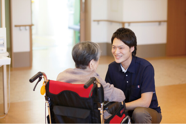 【介護福祉士の仕事】車いすを押して、ブース内のスロープや段差を乗り越えながら、安全に所定の場所まで移動させる仕事をします。また、実際に車いすに乗って、利用者の気持ちを体感します。