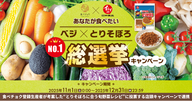 素材の味を生かした石井食品の「とりそぼろ」が旬の野菜とコラボレーション。野菜と「とりそぼろ」を掛け合わせたこだわりのレシピを楽しみながら、投票&対象商品購入で豪華賞品が当たるキャンペーンです。