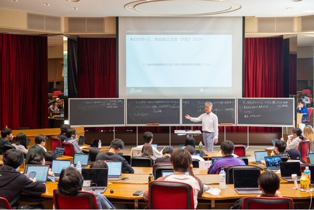 商学部3年生を対象に、自らビジネスプランを構想する授業「事業構想実践」が開講されました。この科目はインテンシブ教育プログラム(集中プログラム)の一つで、新規事業の創出に関わるケースを通して、起業家がどのように事業を実現し、関係者を巻き込みながらチームをつくり上げたのかを学びます。今回は「食品加工会社(X社)」を題材にディスカッションを行い、X社が抱える課題に対する新たな事業展開を検討しました。授業の最終日には、これまでの学びを生かしてチームごとにビジネスプランを発表するプチビジネスプランコンテストを実施しました。