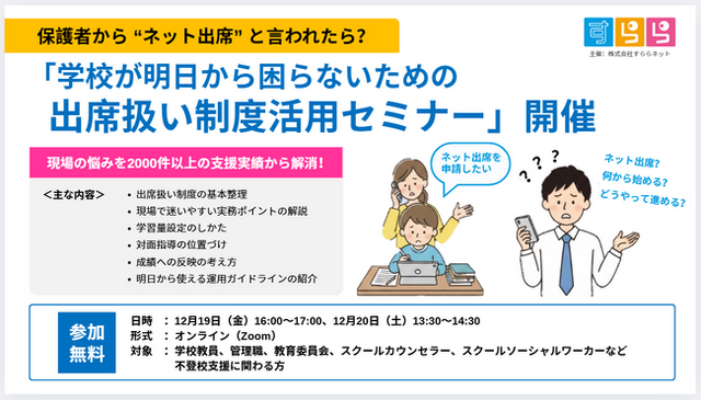 そこで株式会社すららネット(本社:東京都千代田区、代表取締役社長:湯野川孝彦)は、教員・教育委員会・支援者向けに「保護者から “ネット出席”と言われたら? 学校が明日から困らないための出席扱い制度セミナー」を開催します。セミナーでは、制度を保護者・学校の双方から支えてきたすららネットの支援経験をもとに、現場が最も迷いやすいポイントを“明日から使える形”で解説します。