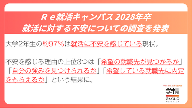 株式会社学情(本社:東京都中央区)は、2028年3月卒業(修了)予定の大学生・大学院生を対象に、「就職活動に対する不安」についてインターネットアンケートを実施しました。今回の調査では、約97%が「不安を感じている」と回答しました。また、具体的に不安を感じる理由の上位3つは「希望の就職先が見つかるか」「自分の強みを見つけられるか」「希望している就職先に内定をもらえるか」という結果に。一方で、就職活動に不安を感じていない学生の回答結果として最も多かったのは「実際の就活が始まるのはまだ先だから」というものでした。