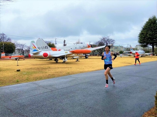 県営「彩の森入間公園」をスタートし、そのまま隣接する「入間基地」へ進入します。自衛隊の敷地内、普段はフェンス越しにしか見られない景色の中をランナーが駆け抜けます。