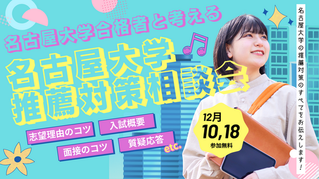 総合型選抜・推薦入試専門塾のルークス志塾(運営:Loohcs株式会社)は、名古屋大学をはじめとする難関国立大学の推薦入試を目指す高校生を対象に、「名古屋大学 推薦入試対策相談会」を2025年12月10日(水)・18日(木)にオンラインで開催します。本イベントでは、名古屋大学推薦入試の合格者が登壇し、実際に行った対策や準備のステップ、専門知識の磨き方などを詳しく解説します。