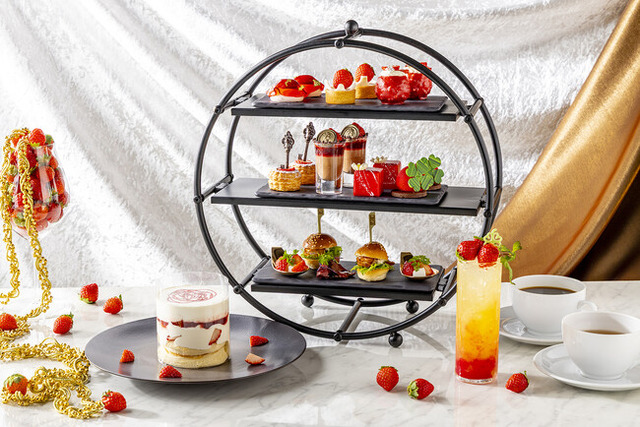 今回のアフタヌーンティーには、新鮮ないちごをたっぷりと使い、ペニー、金箔、クローバー、鍵といったラッキーモチーフを散りばめ、見た目も気分もハッピーに。