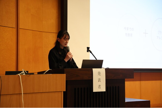 山崎さんは、性教育を「自分と他者を大切にするための力を育てること」と捉え直し、学生を対象にインタビュー調査を行いました。その結果、信頼できる情報提供や、医療・心理的なサポートへつながる仕組みが求められていることを報告しました。また、学生が安心して学び、相談できる場づくりを目指して「みんなの保健室」というイベントを企画・実施し、その構成や運営、当日の成果を紹介しました。あわせて、参加状況を振り返る中で、新たな課題として「安心して話せる空気の不足」が明らかになったことも共有しました。これまでの気づきや試行錯誤を踏まえ、学生が気軽に声をかけ合い、支え合える環境づくりの重要性を示しました。