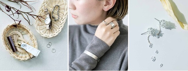 すっきりとしたシルバー色の金具と組み合わせた上品な3種類のデザインは、それぞれ違う印象をまとえるのも魅力です。